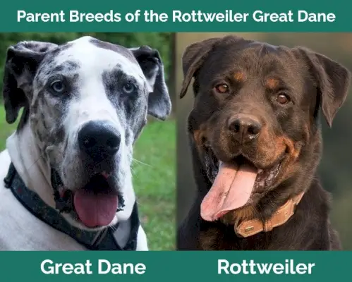 Rodičia dogy Rottweiler Mix. Vľavo: Nemecká doga (zdroj: BelaMarie, Pixabay), vpravo: Rotvajler (zdroj: Freepics4you, Pixabay)